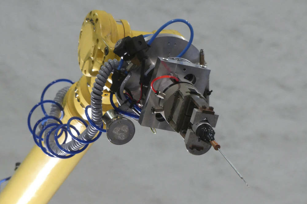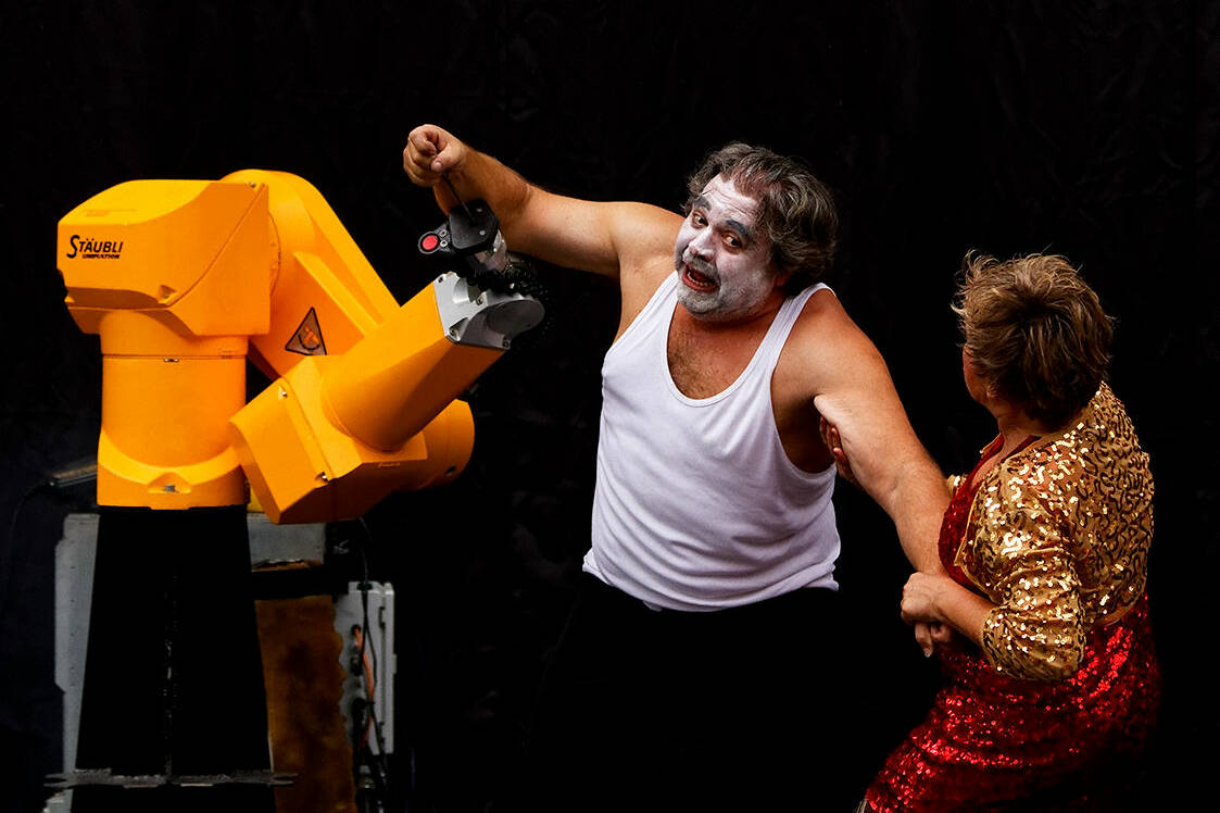 – Proposition de spectacles vivants interactifs, poétique, philosophique avec des robots industriels, transformés et programmés comme acteur.