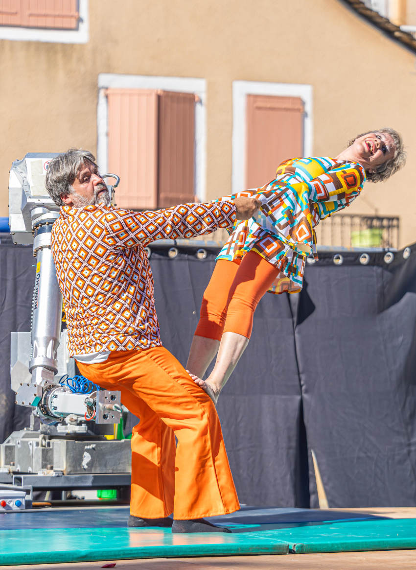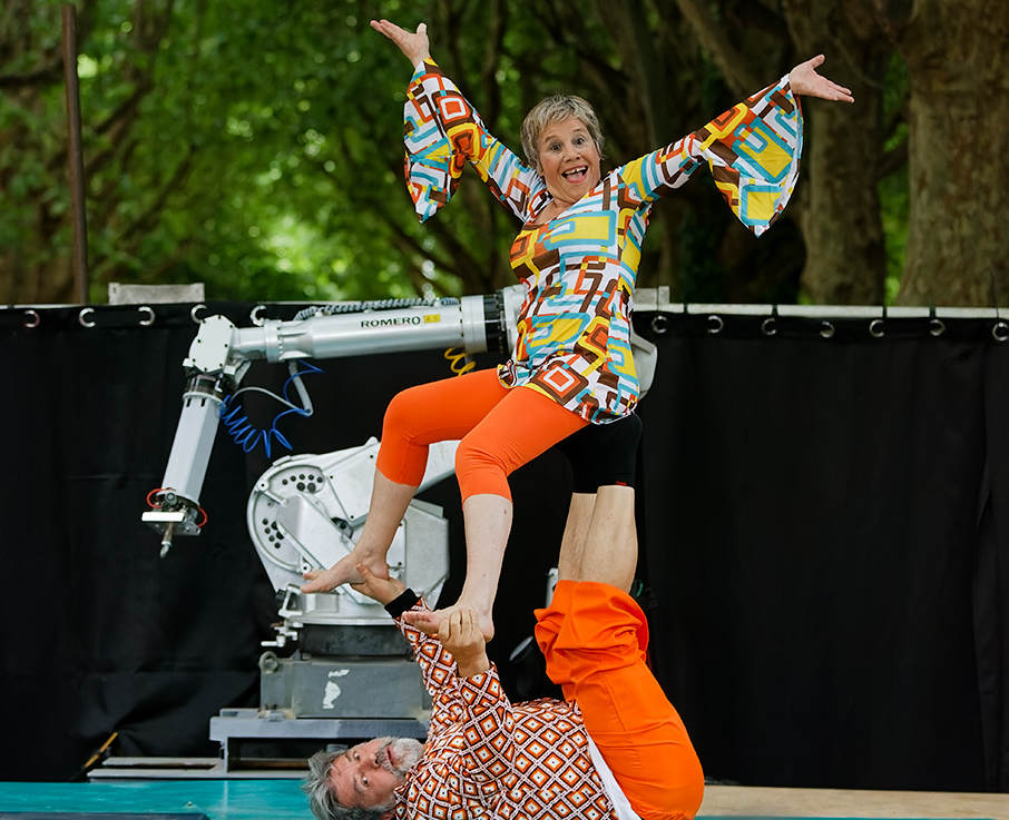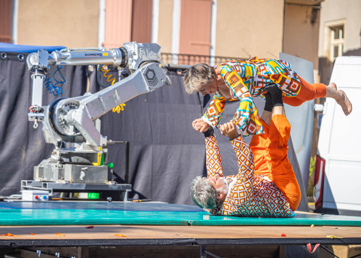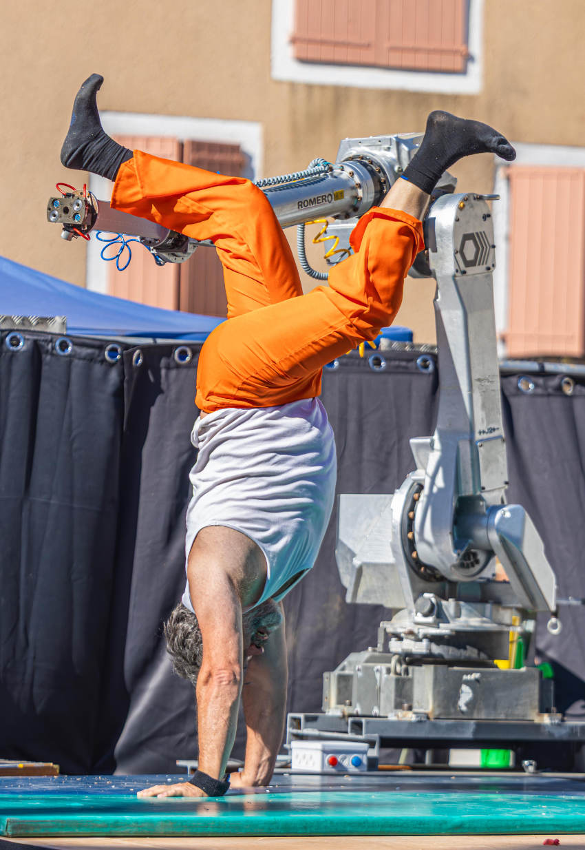 Sur une scène nomade, faite d’un camion, d’une remorque et d’une caravane, s’élève un théâtre forain à la croisée des arts : danse, acrobatie et technologie.Deux comédiens vieillissants — Rita, rêveuse, star mélancolique, amoureuse de son propre corps, et Marco, ex-acrobate glorieux des années 70 — partagent la piste avec un troisième protagoniste inattendu : un robot industriel, réchappé des chaînes de montage.Ce dernier, monumental et sensible, se déploie, s’anime, se fait partenaire de jeu, de danse, d’émotion. Il construit la scène, en devient le cœur, l’ami fidèle, presque humain.Il enchaîne les exploits mécaniques avec une précision troublante, jusqu’à se transformer en miroir de nos limites et de nos désirs.Entre poésie, nostalgie et vertige technologique, ce spectacle hybride interroge nos récits intimes, nos corps qui fatiguent, et cette étrange tendresse qu’on peut ressentir pour une machine.